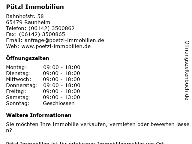 | Öffnungszeiten Pötzl Immobilien in Raunheim anzeigen | |