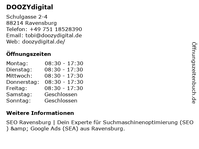 | Öffnungszeiten DOOZYdigital in Ravensburg anzeigen | |
