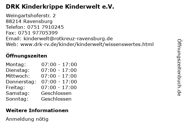1 Johanniter-Kinderkrippe Pfiffikus Ravensburg (Entfernung: 0,43 km) An Der Bleicherei 3/1, 88214 Ravensburg 4 DRK-Landesschule Bildungseinrichtung Ravensburg (Entfernung: 4,09 km) Ulmer Str. 95-97, 88212 Ravensburg 5 DRK Kindertageseinrichtung Kinderhaus Bullerbü (Entfernung: 4,91 km) Ravensburger Str. 33, 88250 Weingarten 6 |