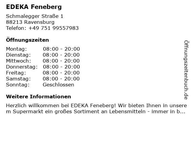 | Öffnungszeiten EDEKA Feneberg in Ravensburg anzeigen | |