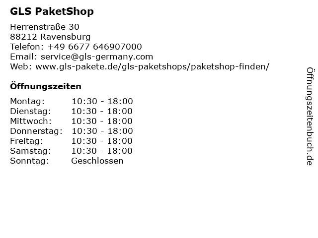 | Öffnungszeiten GLS PaketShop in Ravensburg anzeigen | |