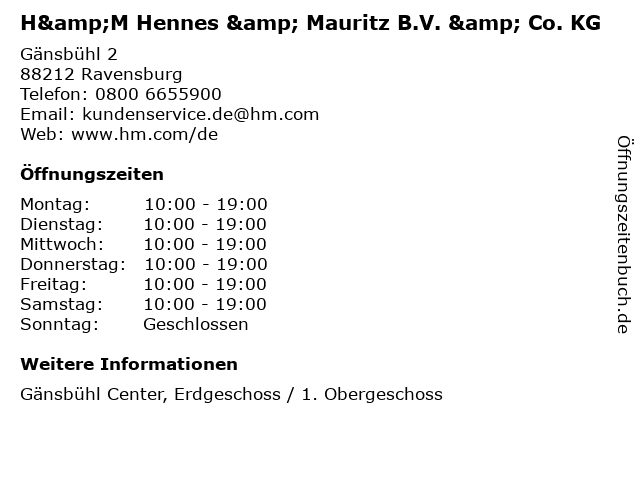 H&M Hennes & Mauritz B.V. & Co. KG in Ravensburg: Telefonnummer, Öffnungszeiten und Adresse