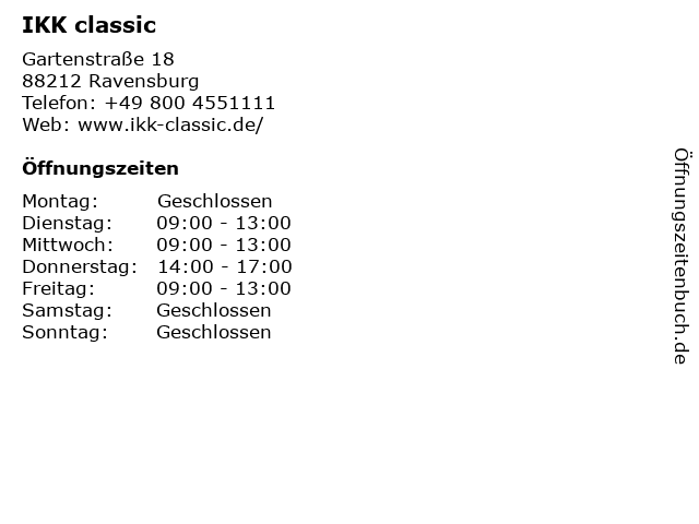 | Öffnungszeiten IKK classic in Ravensburg anzeigen | |