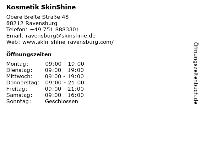| Öffnungszeiten Kosmetik SkinShine in Ravensburg anzeigen | |