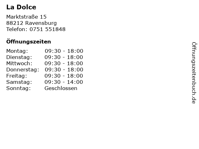 | Öffnungszeiten La Dolce in Ravensburg anzeigen | |