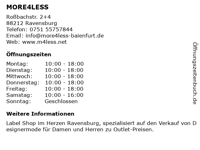 | Öffnungszeiten MORE4LESS in Ravensburg anzeigen | |