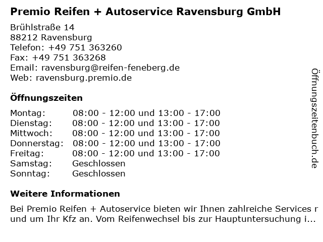 Beschreibung des Unternehmens:Fit für den Sommer? Jetzt Reifen wechselnBuchen Sie jetzt Ihren Termin zum Reifenwechsel online bei Premio Reifen + Autoservice Ravensburg Inh. Markus Schieron Ihre Meisterwerkstatt vor Ort. Zum Angebot |