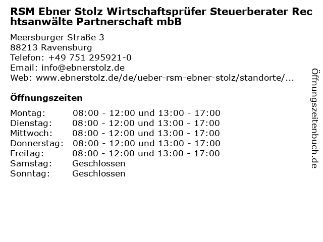 1 Volz, Angelstorf, Manok, Lehmann & Partner mbB Rechtsanwälte (Entfernung: 0,01 km) Meersburger Straße 3, 88213 Ravensburg 5 Rechtsanwälte Rommelspacher, Glaser, Prüß & Mattes PartG mbB (Entfernung: 1,57 km) Eywiesenstr. 6, 88212 Ravensburg 6 Scheftschik + Partner mbB Steuerberatungsgesellschaft (Entfernung: 2,91 km) St.-Konrad-Straße 51, 88250 Weingarten |