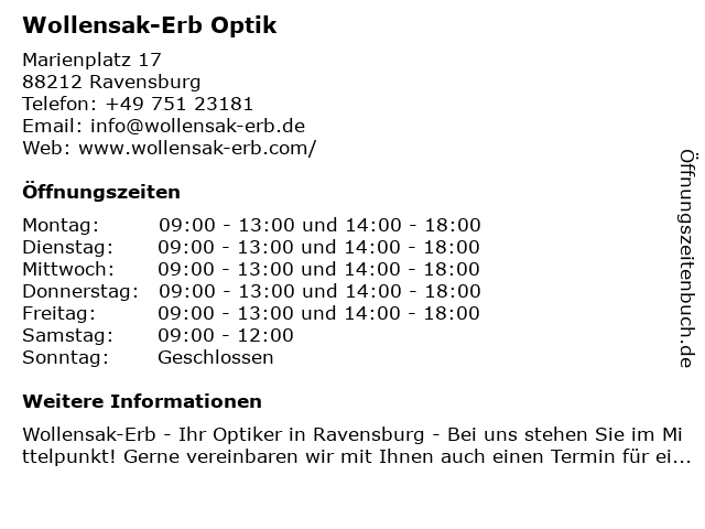 Öffnungszeiten Wollensak-Erb Optik in Ravensburg anzeigen | |