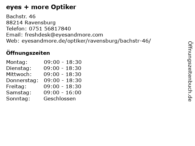 | Öffnungszeiten eyes + more Optiker in Ravensburg anzeigen | |