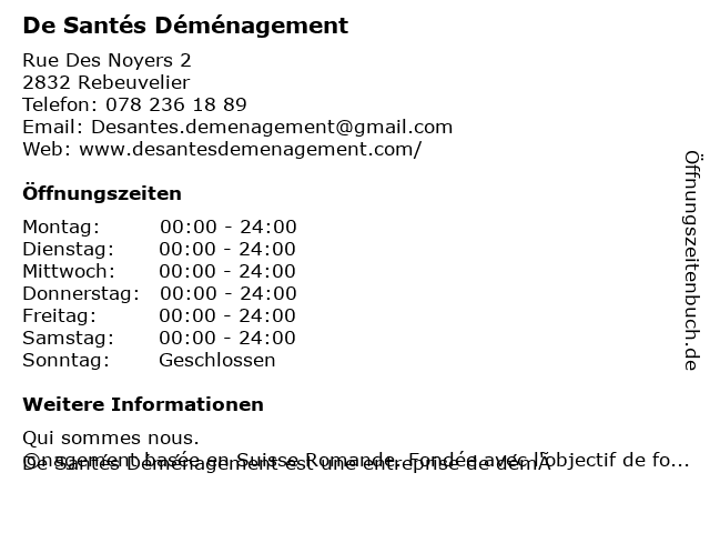 | Öffnungszeiten De Santés Déménagement in Rebeuvelier anzeigen | |