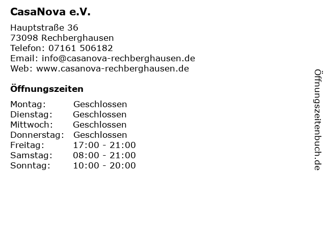 | Öffnungszeiten CasaNova e.V. in Rechberghausen anzeigen | |