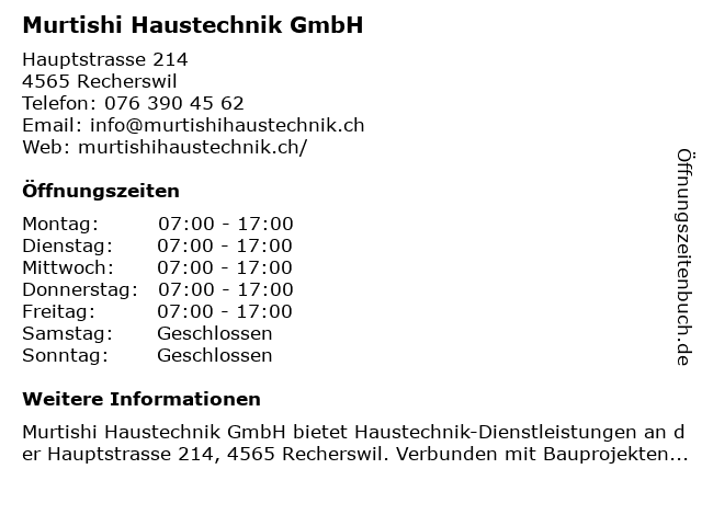 | Öffnungszeiten Murtishi Haustechnik GmbH in Recherswil anzeigen | |