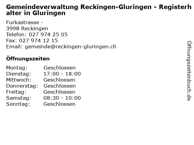 1 Gemeindeverwaltung Reckingen-Gluringen - Gemeindekanzlei in Reckingen (Entfernung: 0,00 km) Furkastrasse -, 3998 Reckingen 6 |