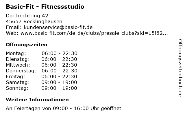 | Öffnungszeiten Basic-Fit - Fitnessstudio in Recklinghausen anzeigen | |