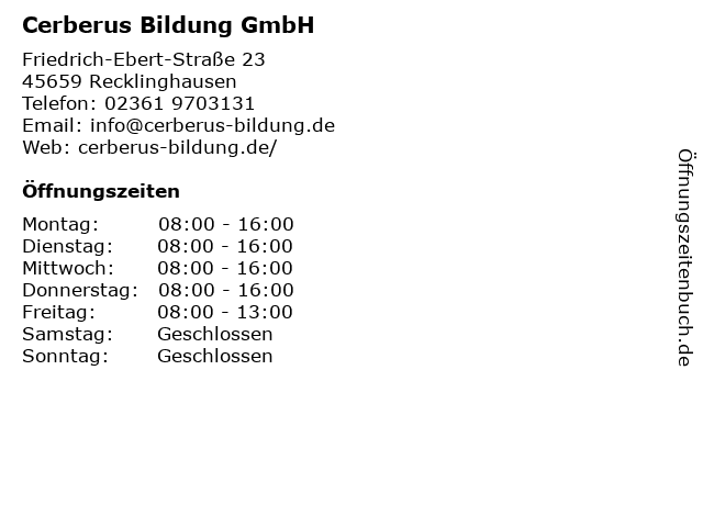 | Öffnungszeiten Cerberus Bildung GmbH in Recklinghausen anzeigen | |