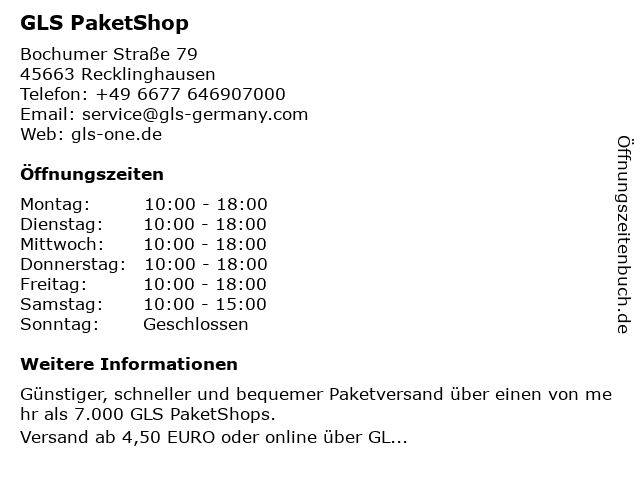 | Öffnungszeiten GLS PaketShop in Recklinghausen anzeigen | |
