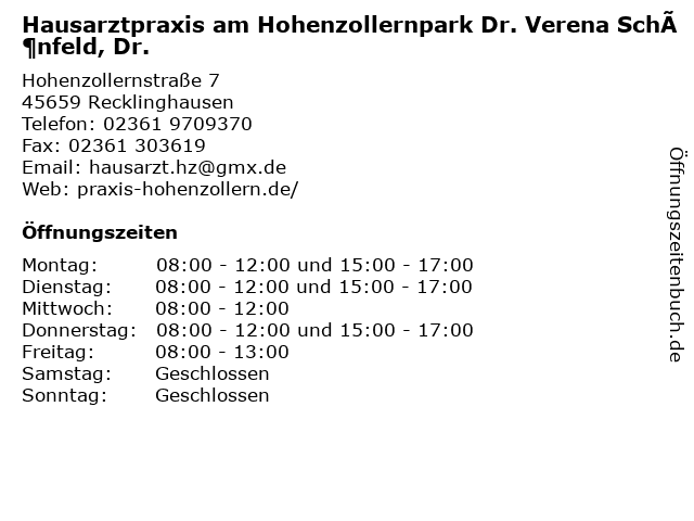 Branchen & Suchbegriffe zu Hausarztpraxis am Hohenzollernpark Dr. Verena Schönfeld, Dr.:dr., hausarztpraxis, hohenzollernpark, schönfeld, verena |