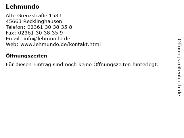 | Öffnungszeiten Lehmundo in Recklinghausen anzeigen | |