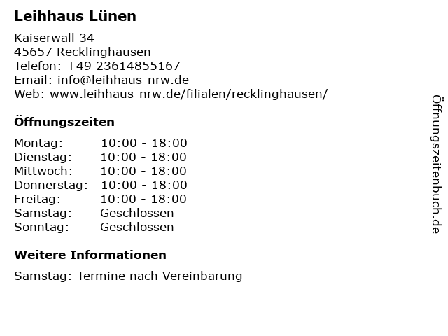 | Öffnungszeiten Leihhaus Lünen in Recklinghausen anzeigen | |