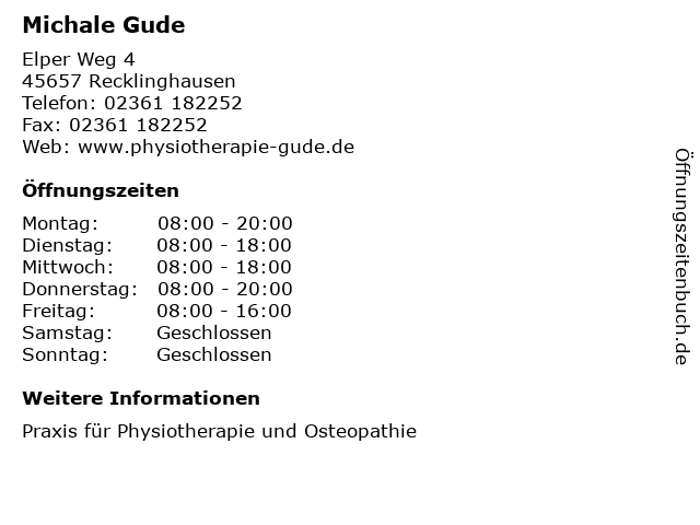 | Öffnungszeiten Michale Gude in Recklinghausen anzeigen | |
