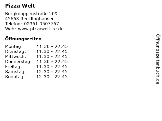 | Öffnungszeiten Pizza Welt in Recklinghausen anzeigen | |