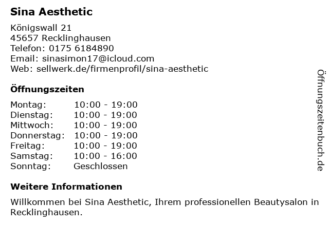 | Öffnungszeiten Sina Aesthetic in Recklinghausen anzeigen | |