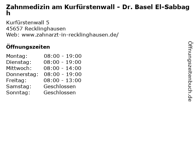 | Öffnungszeiten Zahnmedizin am Kurfürstenwall - Dr. Basel El-Sabbagh in Recklinghausen anzeigen | |