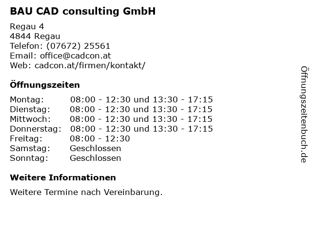 | Öffnungszeiten BAU CAD consulting GmbH in Regau anzeigen | |