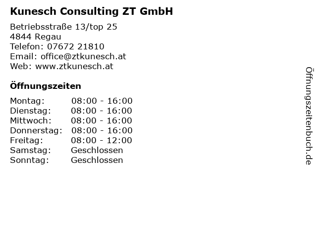 | Öffnungszeiten Kunesch Consulting ZT GmbH in Regau anzeigen | |