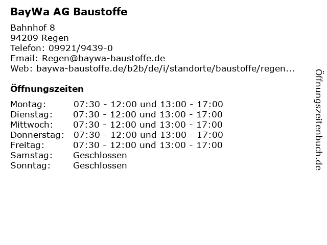 | Öffnungszeiten BayWa AG Baustoffe in Regen anzeigen | |