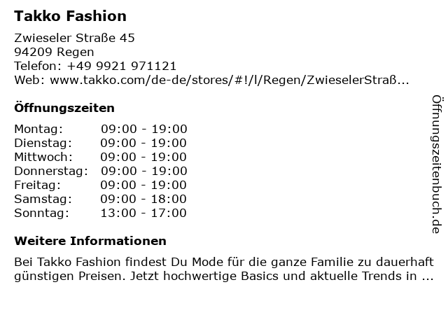 | Öffnungszeiten Takko Fashion in Regen anzeigen | |