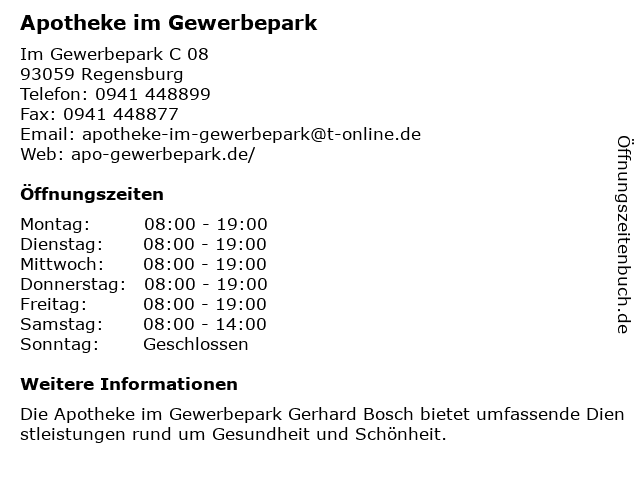 | Öffnungszeiten Apotheke im Gewerbepark in Regensburg anzeigen | |