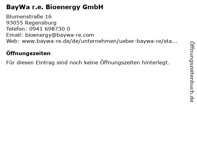 | Öffnungszeiten BayWa r.e. Bioenergy GmbH in Regensburg anzeigen | |