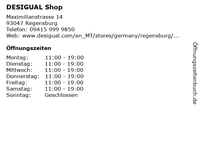 | Öffnungszeiten DESIGUAL Shop in Regensburg anzeigen | |