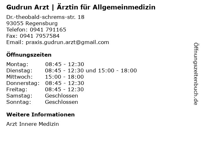 1 Otto Arzt, Arzt für Innere Medizin und Kardiologie (Entfernung: 0,01 km) Dr.-Theobald-Schrems-Straße 18, 93055 Regensburg 5 Homöopathische Praxis am Dom - Dr. Gudrun Wedell-Funk (Entfernung: 1,29 km) Pfauengasse 2, 93047 Regensburg 6  |