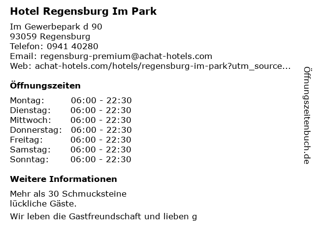 | Öffnungszeiten Hotel Regensburg Im Park in Regensburg anzeigen | |