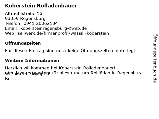 | Öffnungszeiten Koberstein Rolladenbauer in Regensburg anzeigen | |