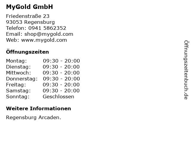 | Öffnungszeiten MyGold GmbH in Regensburg anzeigen | |