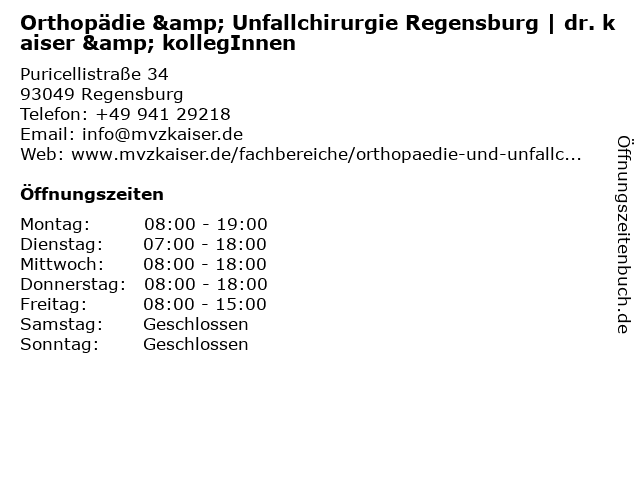 1 Ästhetische Medizin & Plastische Chirurgie | Regensburg | dr. kaiser & kollegInnen (Entfernung: 0,00 km) Puricellistraße 34, 93049 Regensburg 2 Zahnmedizin & Kieferorthopädie | dr. kaiser & kollegInnen (Entfernung: 0,00 km) Puricellistraße 34, 93049 Regensburg 4 Privatradiologie dr. kaiser & kollegInnen Regensburg (Entfernung: 0,08 km) Puricellistraße 11, 93049 Regensburg 6 |