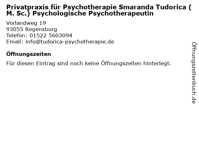 | Privatpraxis für Psychotherapie Smaranda Tudorica (M. Sc.) Psychologische Psychotherapeutin anrufen | |