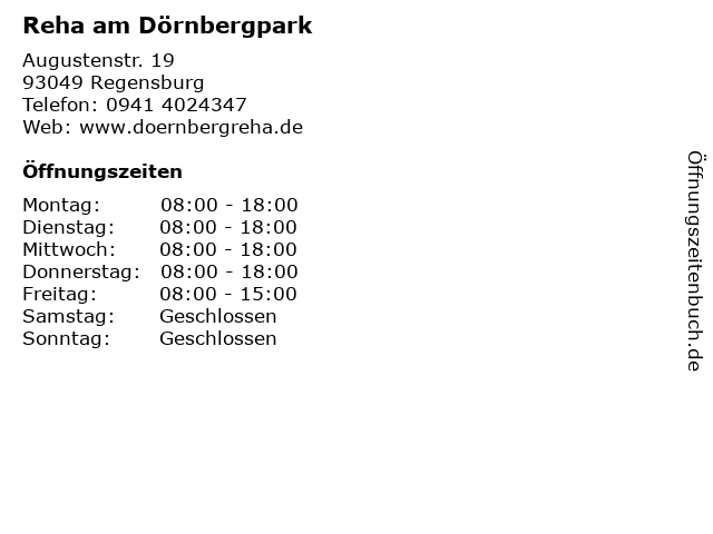 | Öffnungszeiten Reha am Dörnbergpark in Regensburg anzeigen | |