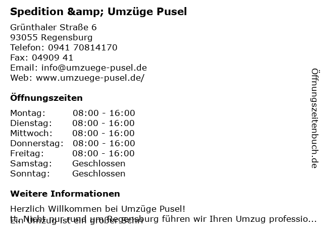 | Öffnungszeiten Spedition & Umzüge Pusel in Regensburg anzeigen | |