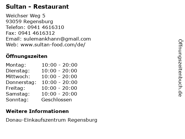 | Öffnungszeiten Sultan - Restaurant in Regensburg anzeigen | |