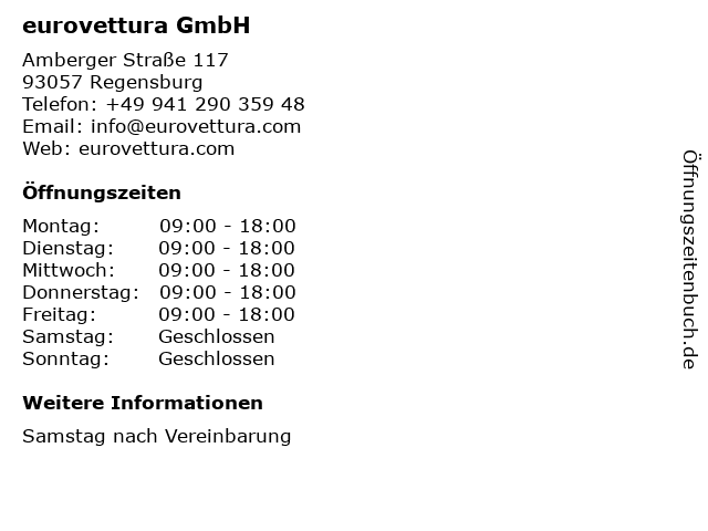 | Öffnungszeiten eurovettura GmbH in Regensburg anzeigen | |