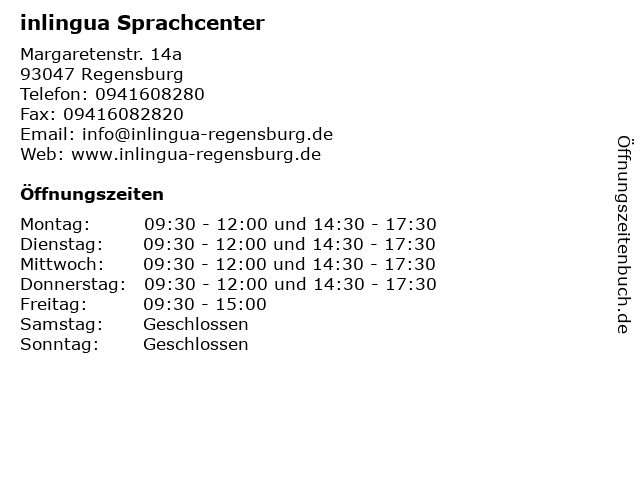 | Öffnungszeiten inlingua Sprachcenter in Regensburg anzeigen | |