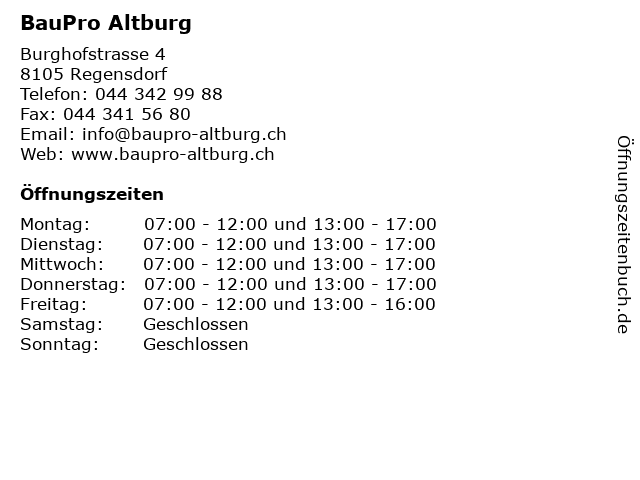 | Öffnungszeiten BauPro Altburg in Regensdorf anzeigen | |