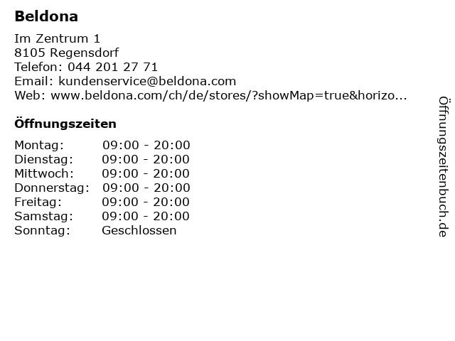 | Öffnungszeiten Beldona in Regensdorf anzeigen | |