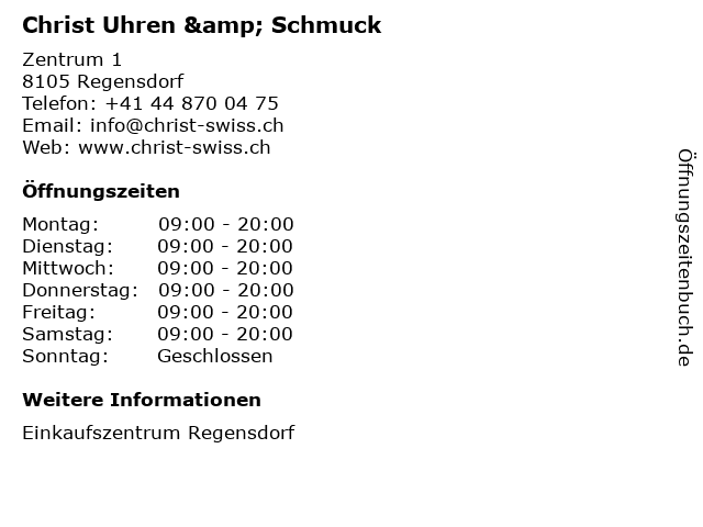 | Öffnungszeiten Christ Uhren & Schmuck in Regensdorf anzeigen | |
