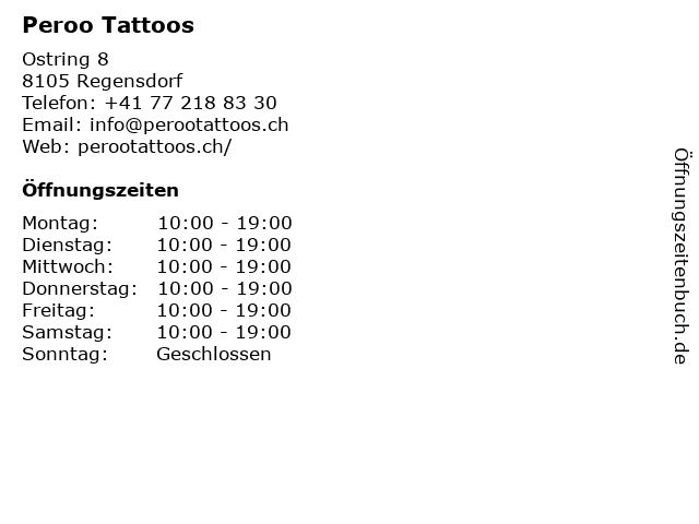 | Öffnungszeiten Peroo Tattoos in Regensdorf anzeigen | |